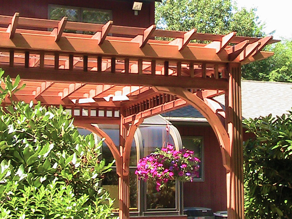 This pergola may appear simple, but the area it fits into is very irregular and required lots and lots of measurements and correspondence. It's freestanding, but has only three posts and IS connected to the house where the fourth post would have been. The project was tedious because of it's complexity, but working with the client was a pleasure because he knew exactly what he wanted and was good at expressing it.